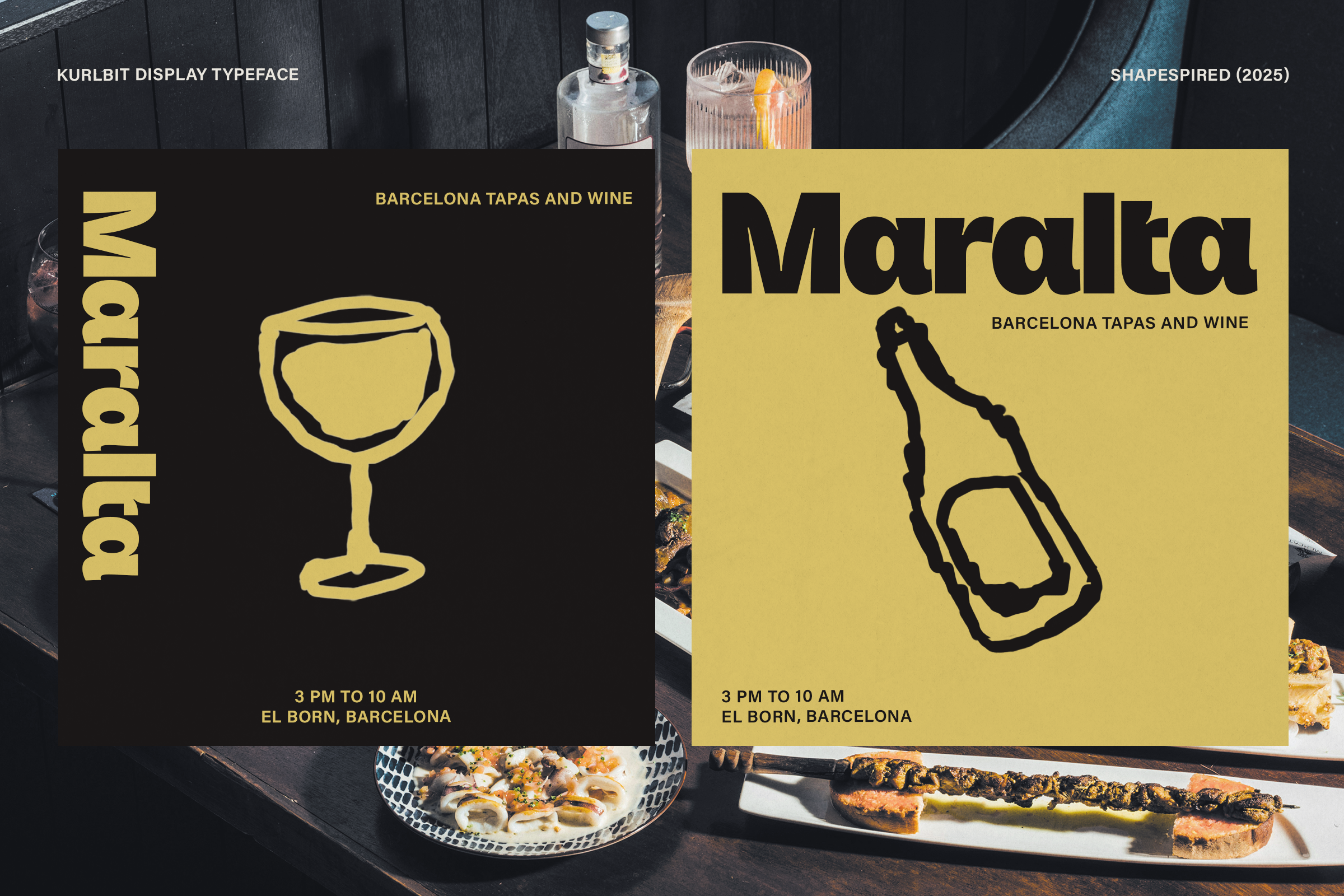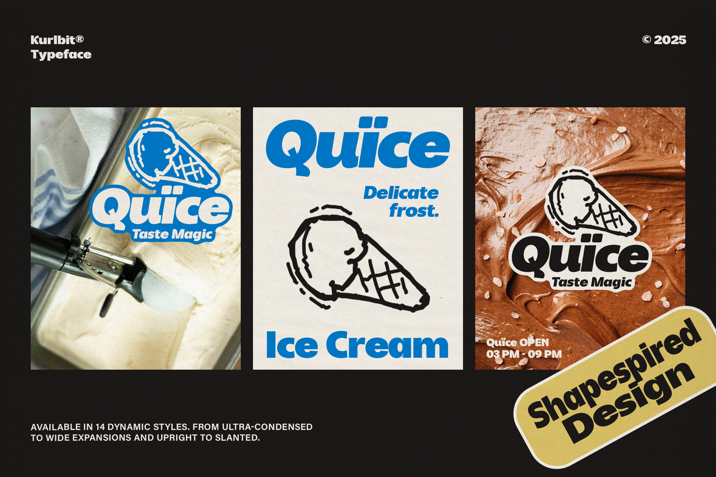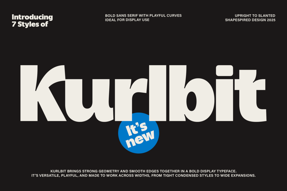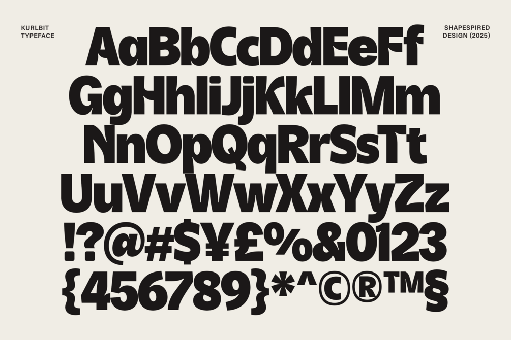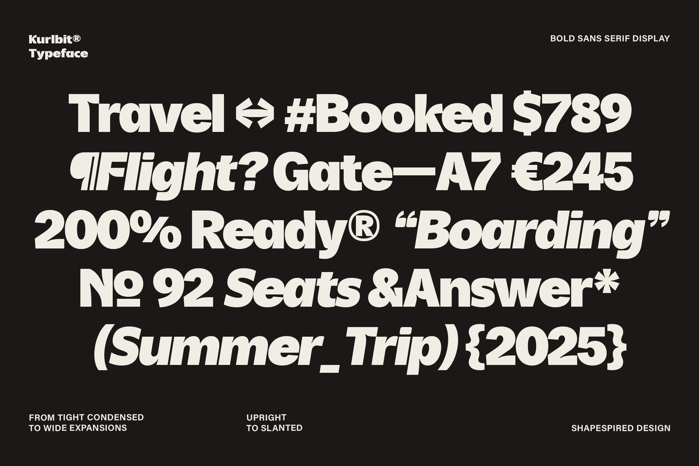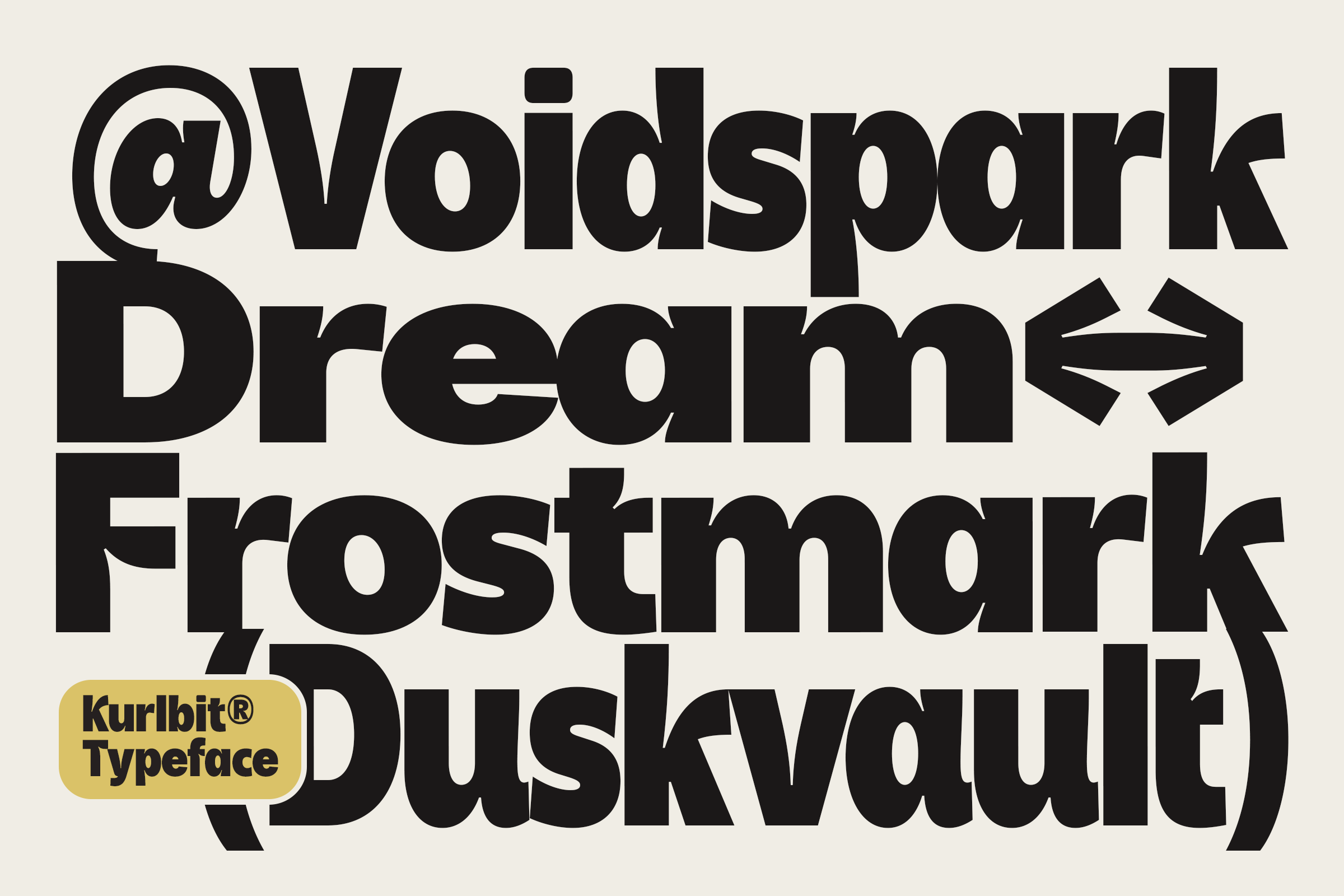 Kurlbit is a versatile sans serif display typeface built for impact. Spanning 14 styles in multiple widths and slants, it adapts to projects that demand strong hierarchy and flexibility. From tight condensed headlines to expansive wide layouts, Kurlbit delivers clarity, consistency, and a touch of personality. Its geometric foundation ensures strength and balance, while subtle curves add a sense of warmth and approachability. Designed for posters, branding, packaging, and digital media, Kurlbit offers a complete system that gives designers the freedom to create bold statements with confidence and precision.