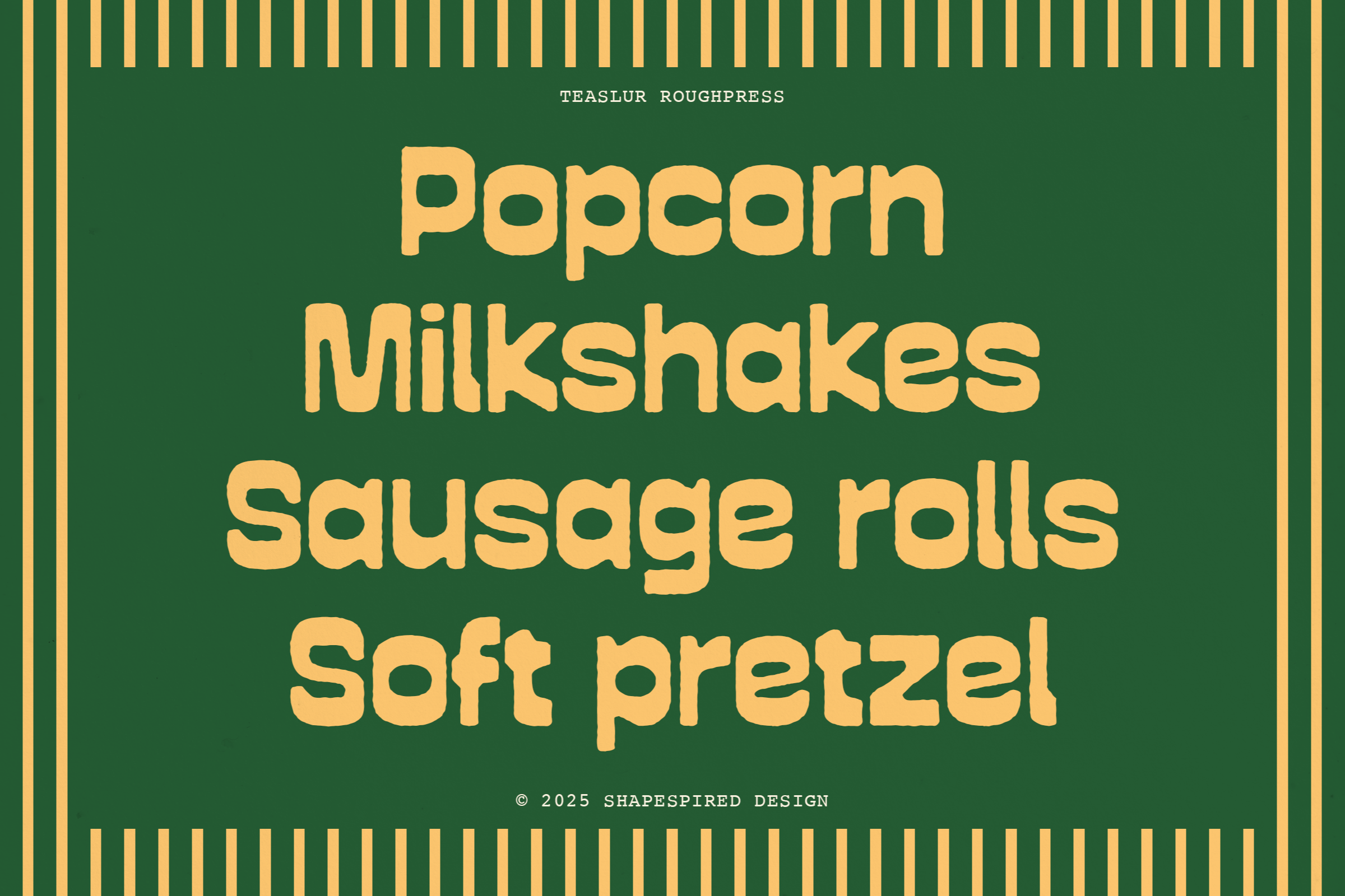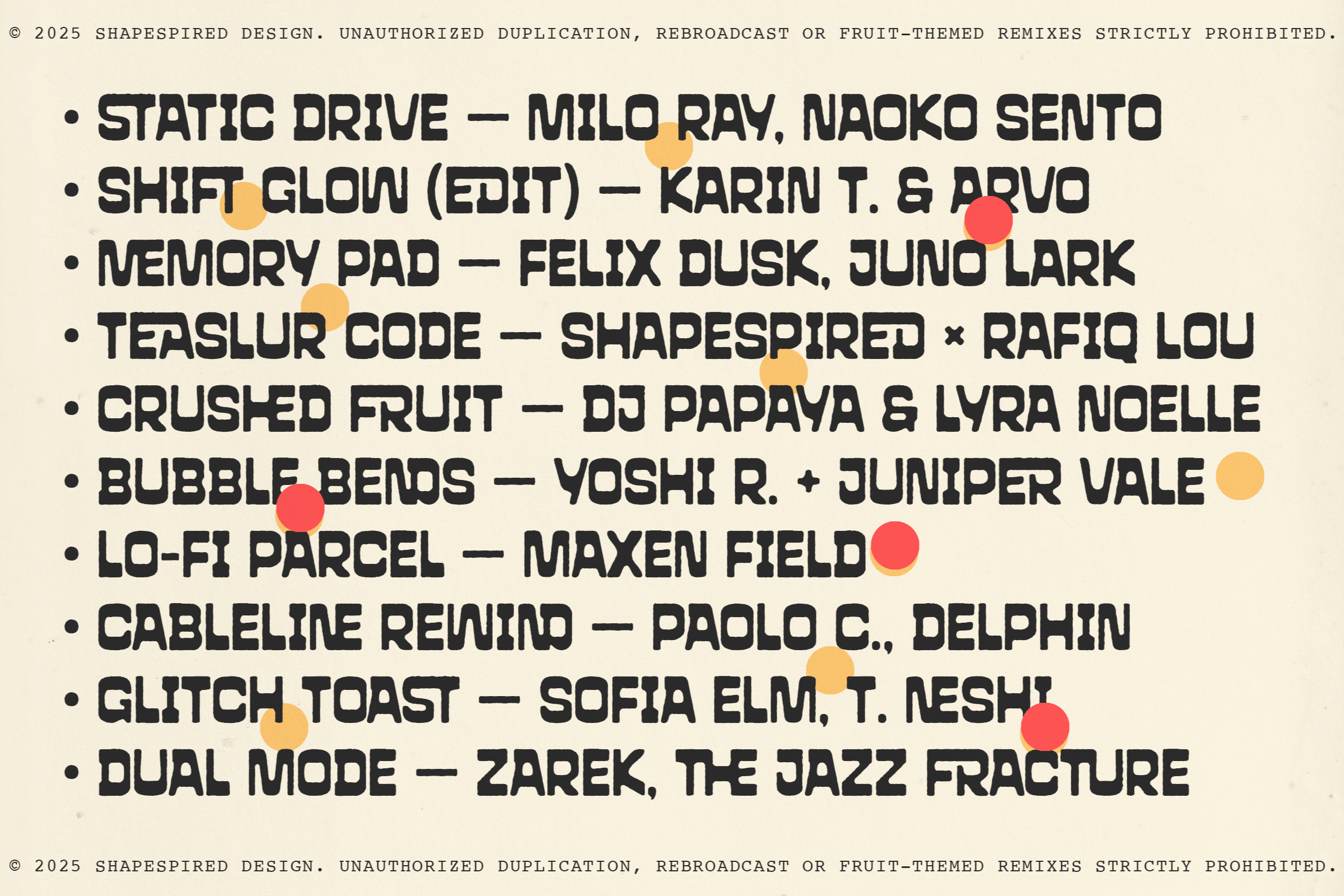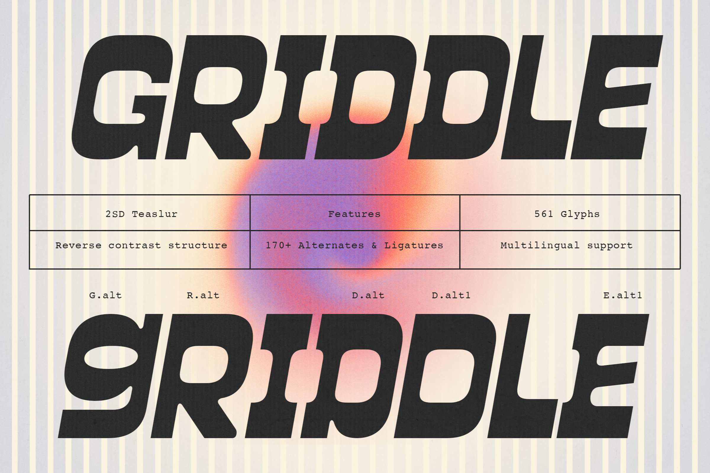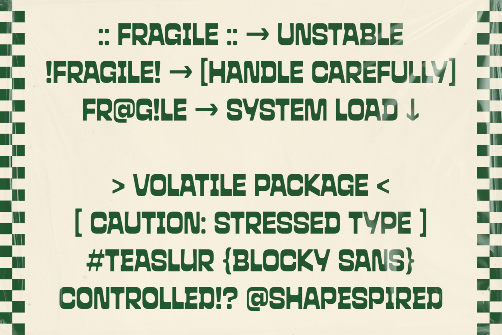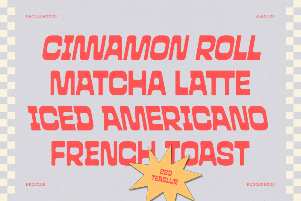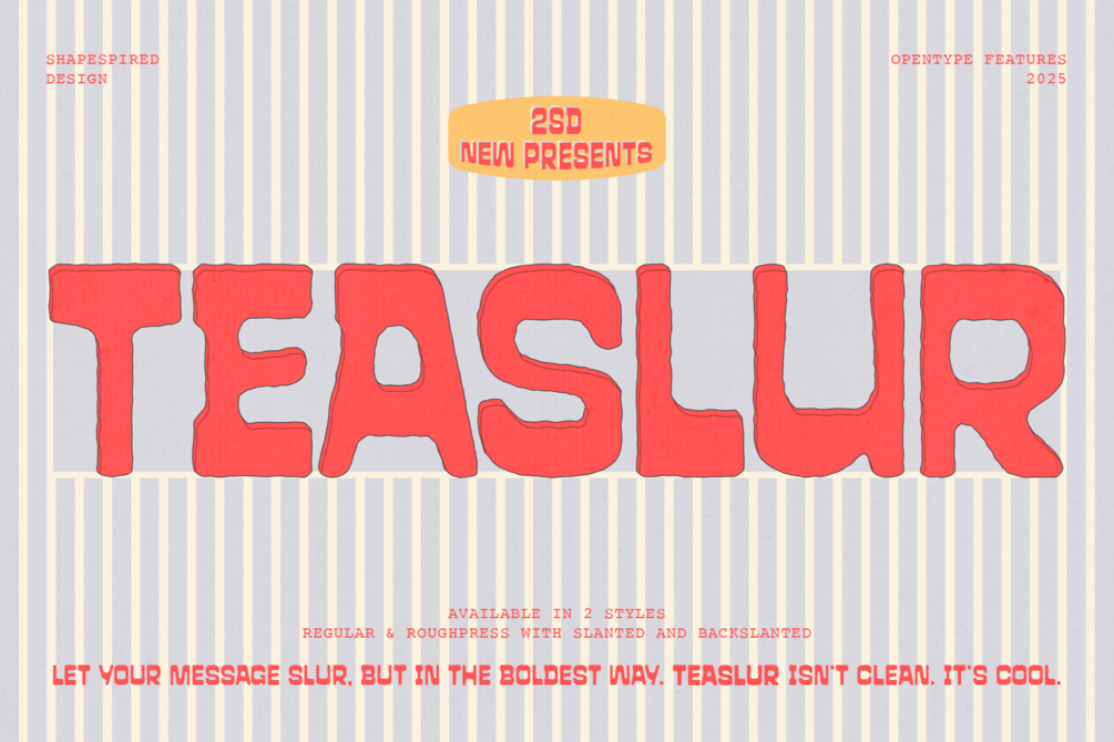 Teaslur is a bold, modular display typeface built with reverse contrast and a whole lot of attitude. Drawing inspiration from industrial signage, retro packaging, and experimental type systems, Teaslur balances brutal structure with quirky expression — all while keeping things readable, stylish, and loud.