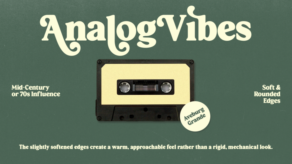 Aveburg Grande is a stylish and adaptable type family inspired by vintage editorial design, mid-century aesthetics, and timeless typography.